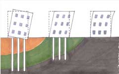 マンション全体を支える基礎工事は、支持層と呼ばれる固い地盤がGL(グランド・レベル)からどれくらいの深さにあるかによって変わってきます。マンションの基礎工事は、この支持層まで杭を打ち込む「杭基礎」と呼ばれる工法が一般的です。 この杭は、杭が長ければ長いほど安心というのは大きな間違い。杭が深く打ち込まれているということは、建物が沈んだり傾いたりしないように支えることのできる支持層が、それだけGLから深い距離にあるということですから、逆にいうと、それだけやわらかい地層が厚いということを意味しているのです。 さらに、この杭が長くなればなるほど、地震のときに揺れが大きくなります。高いハイヒールよりペタンコの運動靴のほうが、体重を支えるうえで重心も低く安定しているのと同じことです。 地表からすぐの浅いところに固い地盤がある場合、通常「直接基礎」と呼ばれる工法がとられます。地面を数メートル掘り下げてコンクリートなどで固めて直接マンションを建てる"面で支える"基礎工事です。これはGLから数メートル掘っただけで固い支持層が出てくることを意味しますから、地盤が非常に良いということです。 「杭基礎」に使われる杭の長さや本数は、建物の重量や形によって違ってきますが、最も頑丈なものは「場所打コンクリート」で、その場で鉄筋の枠を組み、コンクリートを流し込む工法です。このほか、最もよく使われるのが「既成コンクリート枠」、深く軟弱な地盤に使われるのが、円筒状の鉄鋼を使った「鉄管杭」。地震によって杭の頭部が破壊されないようにつくられたのが「鉄管コンクリート杭」となります。これらの基礎工事は、事前の地質・地盤調査や構造計算によって、工法やどの杭を使うかが決まってきます。 |