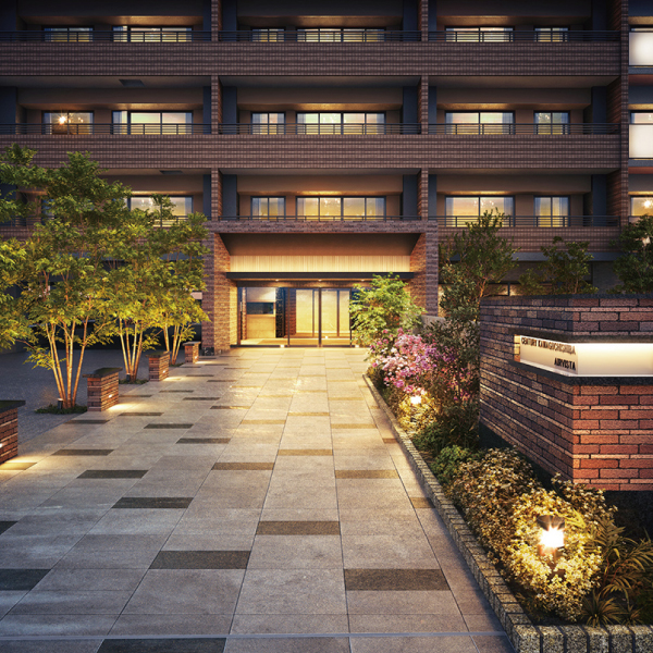 ※掲載の完成予想図は、計画段階の図面を基に描き起こしたもので、実際とは多少異なる場合があります。敷地の植栽の樹種、大きさについては未確定となっており、竣工時には完成予想図程度には成長致しません。植栽は特定の季節の状況を示すものではありません。なお建物外観をご覧いただくために隣地建物等を省略・簡略化しており、実際の風景とは異なります。