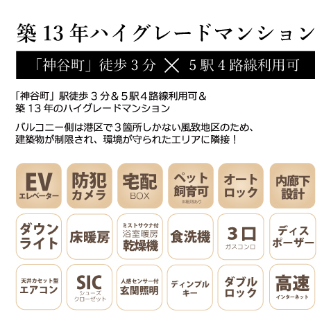 | 交通 | 東京メトロ日比谷線「神谷町」駅徒歩3分 東京メトロ日比谷線「虎ノ門ヒルズ」駅徒歩7分 都営三田線「御成門」駅徒歩8分 東京メトロ銀座線「虎ノ門」駅徒歩11分 東京メトロ南北線「六本木一丁目」駅徒歩13分 |