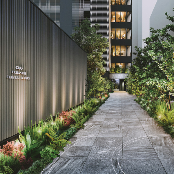※掲載の完成予想図は全て設計段階の図⾯を基に描き起こしたもので、形状・⾊等は実際とは異なる場合があります。形状の細部、設備機器等は表現していません。表現されている植栽は設計段階のものであり、変更になる場合があります。また葉の⾊合いや枝ぶりや樹形は想定であり、竣⼯から⽣育期間を経た状態のものを描いています。また特定の季節状態を⽰すものではありません。予めご了承ください。敷地周辺の建物などについては簡略化しています。