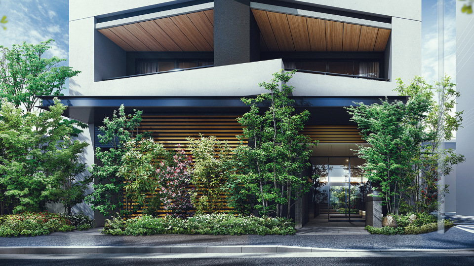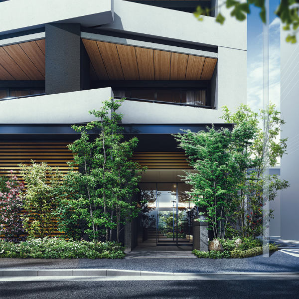 ※掲載のエントランスアプローチ完成予想図は設計段階の図⾯を基に描き起こしたもので、形状・⾊等は実際とは異なる場合があります。形状の細部、設備機器等は表現していません。表現されている植栽は設計段階のものであり、変更になる場合があります。また葉の⾊合いや枝ぶりや樹形は想定であり、竣⼯から⽣育期間を経た状態のものを描いています。また特定の季節状態を⽰すものではありません。敷地周辺の建物などについては簡略化しています。