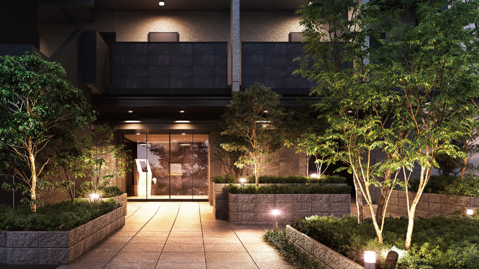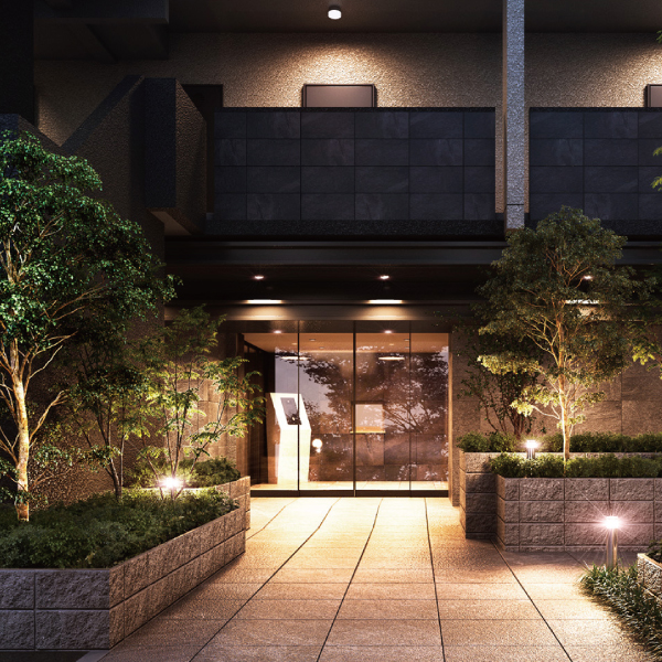 ※掲載の外観完成予想図、エントランスアプローチ完成予想図・ランドプランイメージイラストは図面を基に描き起こしたもので、外観・外構・植栽・色彩等は実際とは異なる場合があります。行政官公庁の指導、施工上の都合及び改良のため設計・仕様・外構等に変更が生じる場合があります。また、現地周辺の建物等を省略して描いております。