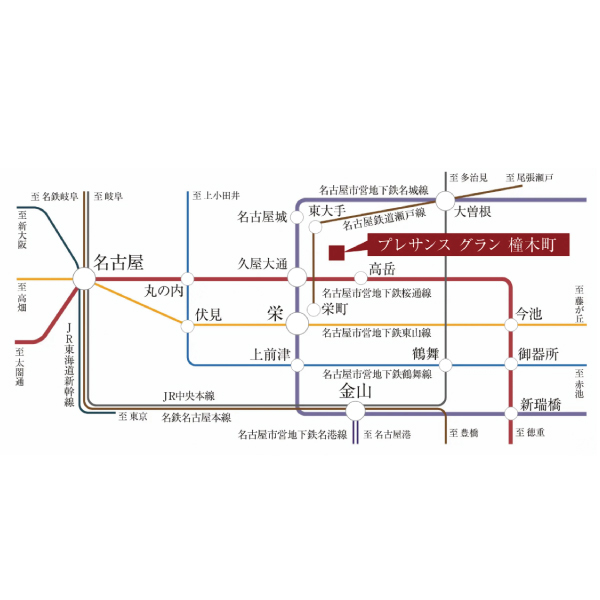 | 交通 | 名鉄瀬戸線「東大手」駅 徒歩8分 名古屋市営地下鉄桜通線「高岳」駅 徒歩11分 名古屋市営地下鉄名城線「名古屋城」駅 徒歩11分 名古屋市営地下鉄名城線・桜通線「久屋大通」駅 徒歩13分 |
