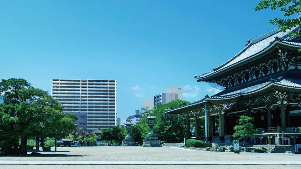 ※掲載の外観完成予想図は、東別院境内から北西方向を撮影した写真(2023年6月撮影)に計画段階の図面を基に描き起こした建物完成予想図をCG合成・加工したもので、実際とは異なります。また、周辺環境・眺望は将来変わる場合があります。また、形状の細部および設備機器等については省略しております。