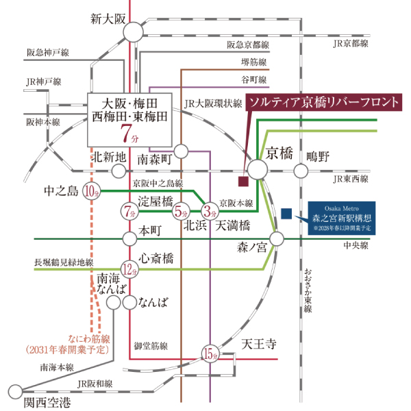 | 交通 | JR大阪環状線・東西線・学研都市線・阪和線・ゆめ咲線・関西空港線「京橋」駅(西口) 徒歩3分 JR東西線「大阪城北詰」駅(1出入口) 徒歩4分 京阪本線「京橋」駅(片町口) 徒歩5分 Osaka Metro長堀鶴見緑地線「大阪ビジネスパーク」駅(2出入口) 徒歩5分 Osaka Metro長堀鶴見緑地線「京橋」駅(2出入口) 徒歩7分 |